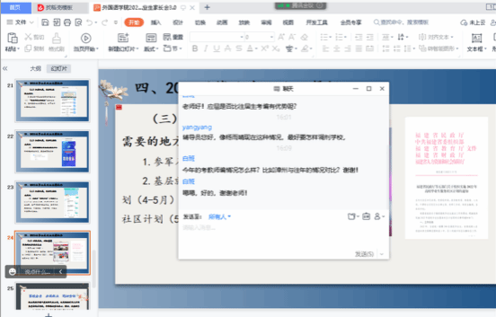 辅导员老师从当前就业现况入手,详细介绍本学院本科毕业生就业发展方向和未来发展趋势,结合当下考研热点分析了近三年毕业生考研形势,就考研复试和调剂方案做了分析,最后结合历届本学院校友的实际经历给予家长们借鉴,建议家校一起联合转变就业思想,抓住机遇,掌握未来的就业主动权。会后家长进行热烈的互动交流,在线答疑释惑。